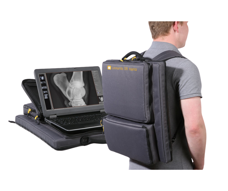 Leonardo DR nano består endast av två komponenter – en trådlös röntgendetektor och en bärbar dator. Med ca 9kg (fullpackad; ryggsäck inkl. laptop, tillbehör och röntgendetektor) är systemet en av världens lättaste bärbara röntgenlösningar.