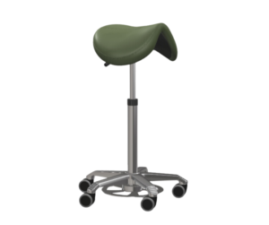 Sadelstol Jumper med extra höjd och fotaktivator, med en 43cm bred polstrad sadel klädd i konstläder.