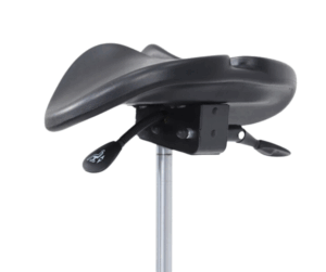 Denna sadelstol har en tvådelad svart sits som främjar en god sittställning och minskar trycket på bäckenbotten – ett bra alternativ om du sitter längre stunder.