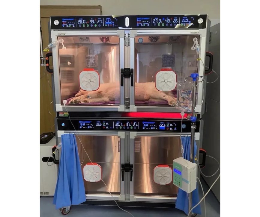 Syrgasbur KaniStar UC-2008D, designad för optimal vård och återhämtning av djur i kritiskt tillstånd. Denna mobila intensivvårdsenhet är idealisk för postoperativ återhämtning, akutvård, andnöd och kroniska tillstånd som exempelvis artrit, samt erbjuder precision i syrekoncentration, temperaturkontroll och luftfuktighetsinställningar.