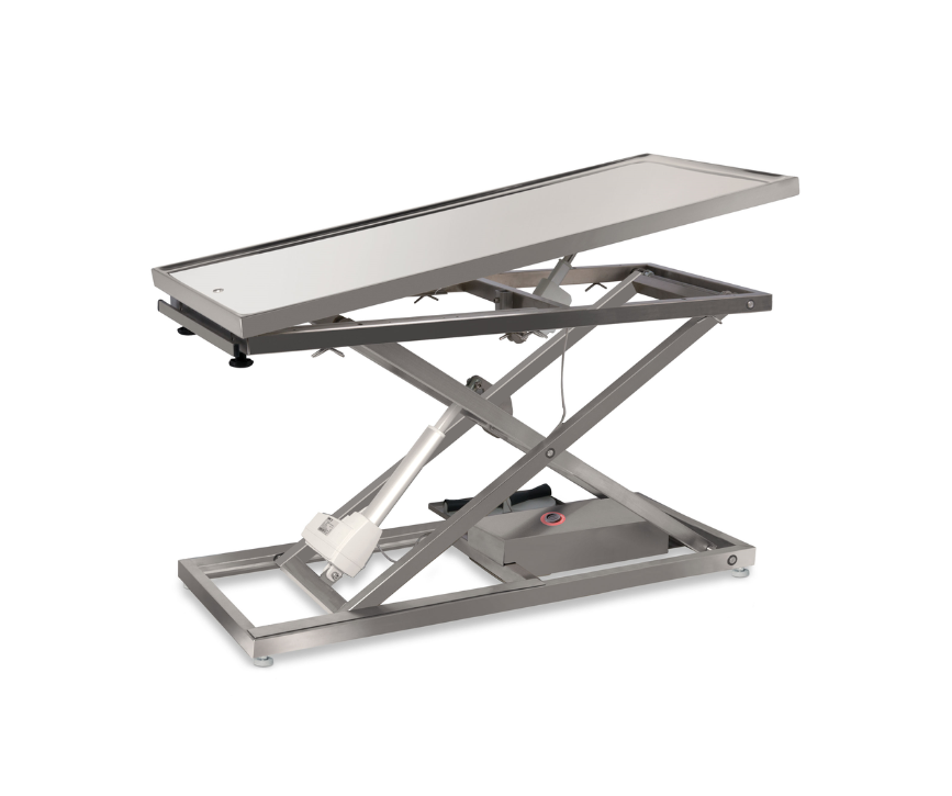 Steglös elektriskt höj & sänkbart bord mellan 28 – 105 cm, detta underlättar för djuret att komma upp samtidigt som en bra arbetshöjd uppnås. Underredets konstruktion bidrar till, och ökar bordets och bordsplattans stabilitet. Fötterna är enskilt ställbara för att få stabilitet även på ett ojämnt golvmaterial.