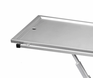 Vetinox operationsbord ELITE med ram och skålad bordsskiva i rostfritt stål. Justera både höjd och bordsskivans lutning elektriskt med hjälp av fotpedalen, – underlättar finjusteringar och åtkomst till hela operationsfältet.