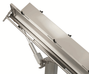 Vetinox operationsbord ELITE med V-top samt ram i rostfritt stål. Justera både höjd och bordsskivans lutning elektriskt med hjälp av fotpedalen, – underlättar finjusteringar och åtkomst till hela operationsfältet.