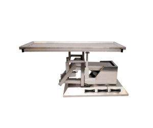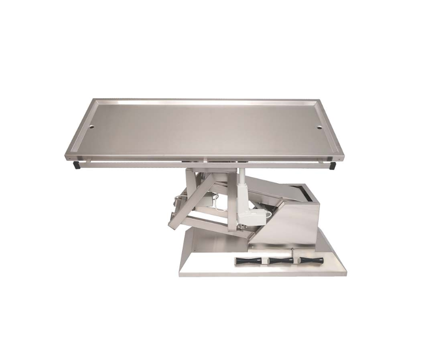 Vetinox operationsbord från TA700-serien, med ram och skålad bordsskiva i rostfritt stål. Justera både höjd och bordsskivans lutning elektriskt med hjälp av fotpedalen, – underlättar finjusteringar och åtkomst till hela operationsfältet. Detta bord har även tillgång till lateral tilt.